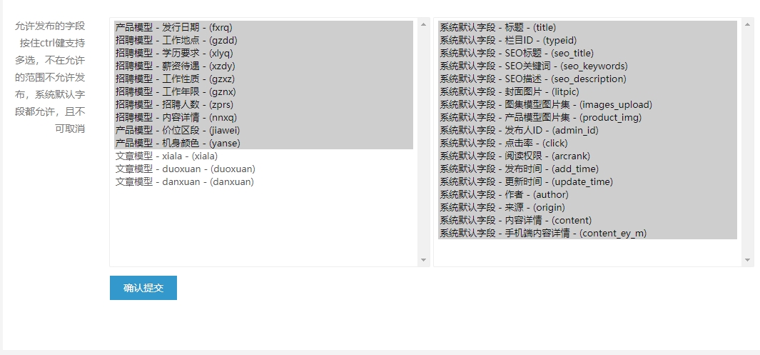 本插件支持单选,多选,下拉,多图,单图,附件,以及图片集,TAG,编辑器入库,真正做到,任何数据皆可入库,支持URL规则定制且自动生成静态(默认提供火车头入库模块)
